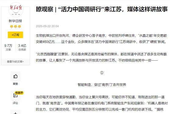【新華日?qǐng)?bào)】瞭觀察 | “活力中國(guó)調(diào)研行”來(lái)江蘇,媒體這樣講故事